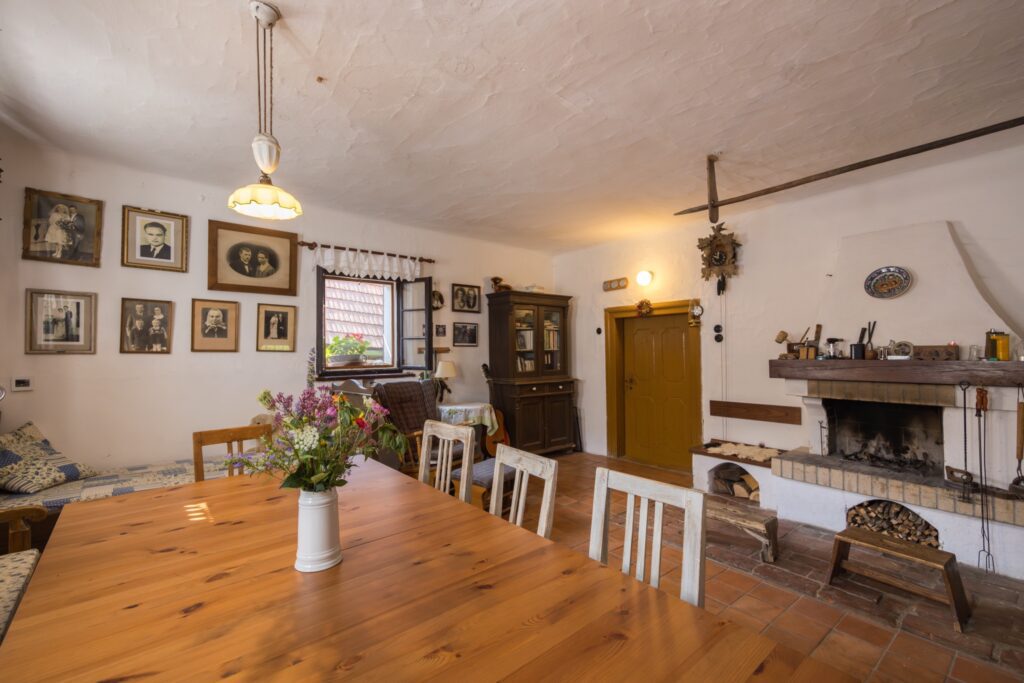 Odpočinkové lůžko, krb, bezpečné houpací křeslo a hodovní stůl pro velkou společnost